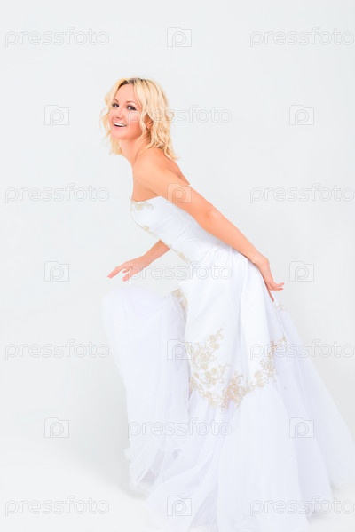 Очаровательная блондинка в белом свадебном платье в студии