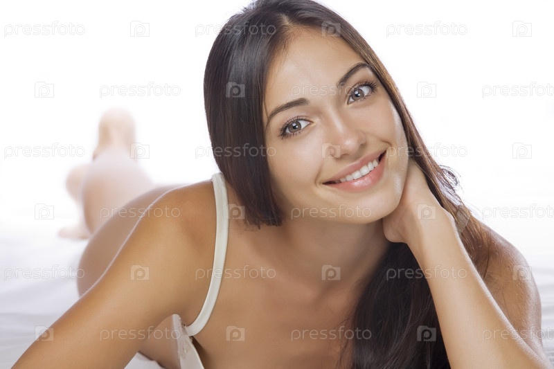 Молодая красивая женщина лежит в постели