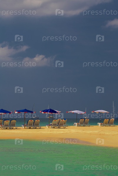 Зонтики и стулья на песчаном пляже