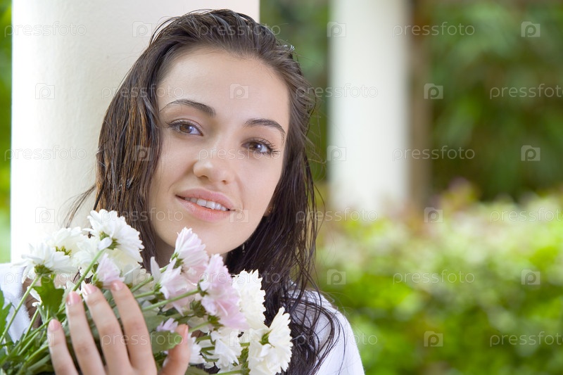 Молодая симпатичная женщина с букетом цветов
