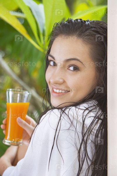Молодая симпатичная женщина пьет сок
