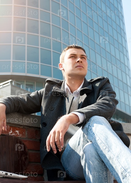 Портрет молодого мужчины с ноутбуком на фоне офисного здания