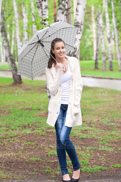 Красивая девушка с зонтиком в руках гуляет по парку