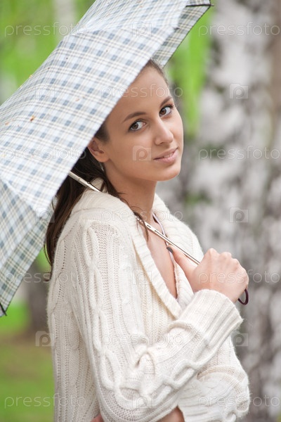 Красивая девушка с зонтиком в руках гуляет по парку