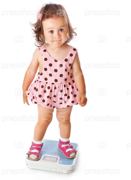 Маленькая девочка стоит на весах. Изолирована на белом фоне