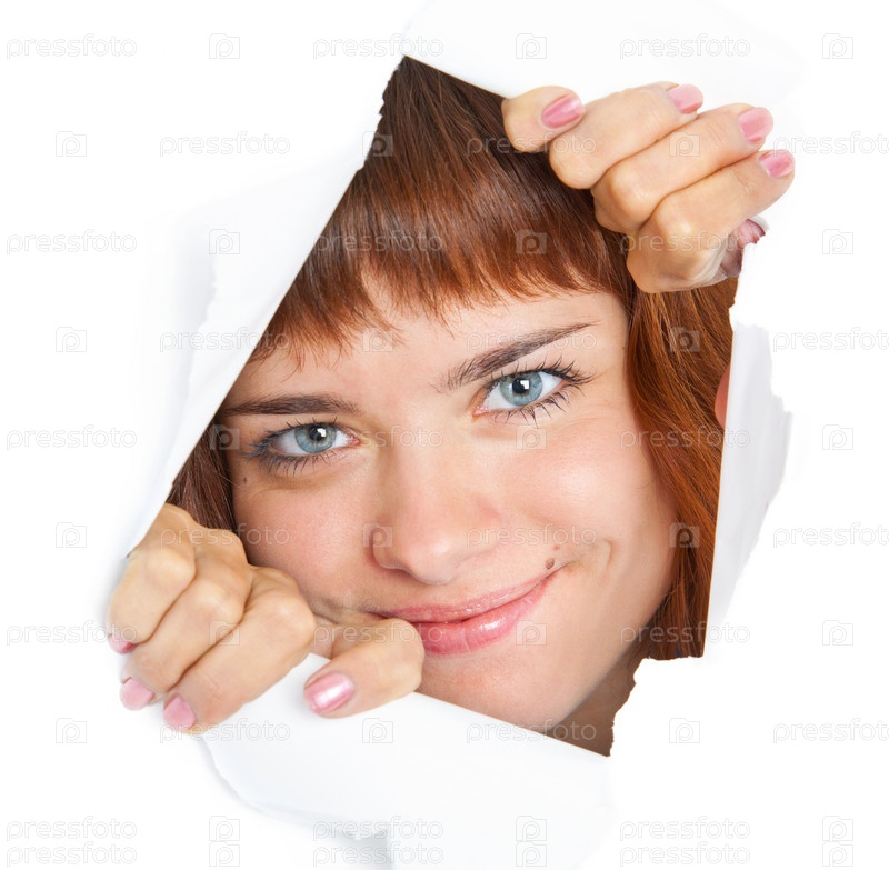 Девушка смотрит через отверстие в бумаге. Изолирована на белом фоне