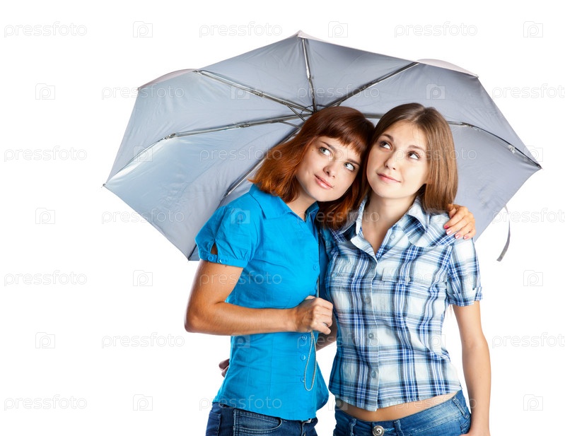 Две девушки-подростки под зонтиком. Изолированы на белом фоне