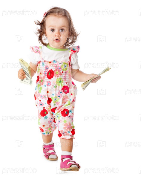 Маленькая девочка с деньгами. Изолирована на белом фоне