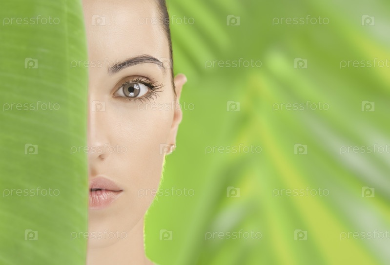 Молодая красивая женщина на фоне зеленых листьев