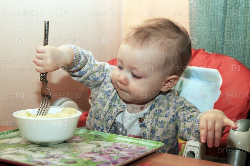 Маленький ребенок ест вилкой