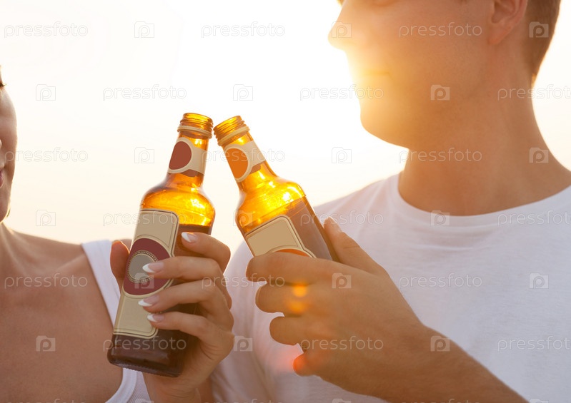 Пара с бутылками на пляжной вечеринке