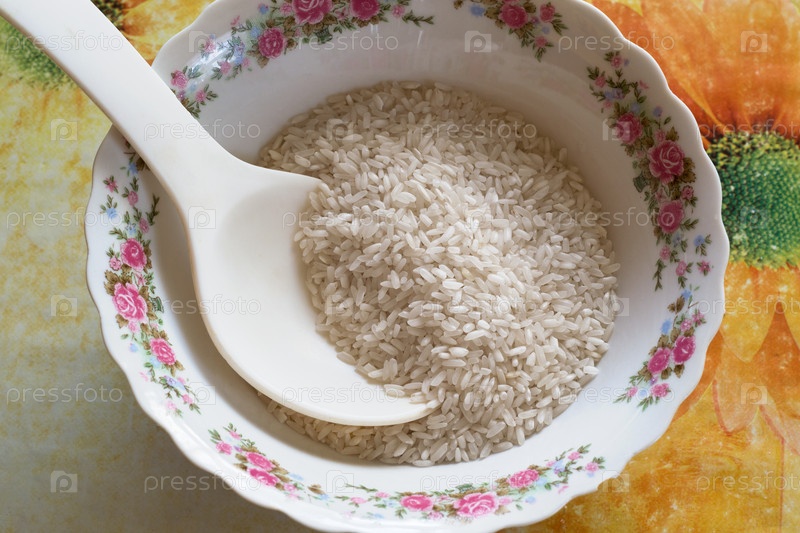 Рис в большой белой тарелке с ложкой