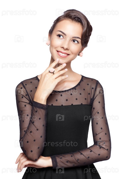 Молодая женщина в черном платье на белом фоне
