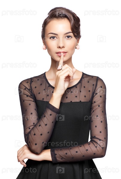 Молодая красивая женщина в черном платье на белом фоне