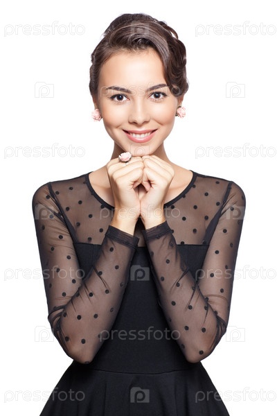 Молодая красивая женщина в черном платье на белом фоне