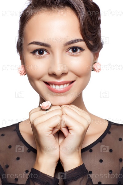 Молодая красивая женщина в черном платье на белом фоне