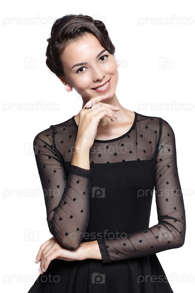 Молодая красивая женщина в черном платье на белом фоне