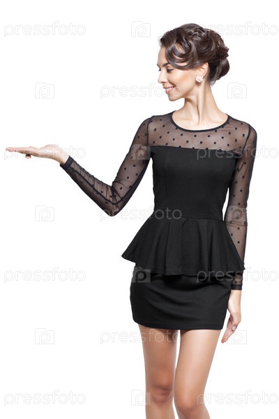 Молодая красивая женщина в черном платье на белом фоне