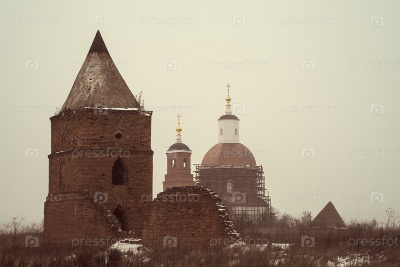 Древний замок и церковь. Россия, Орловская область, село Сабурово