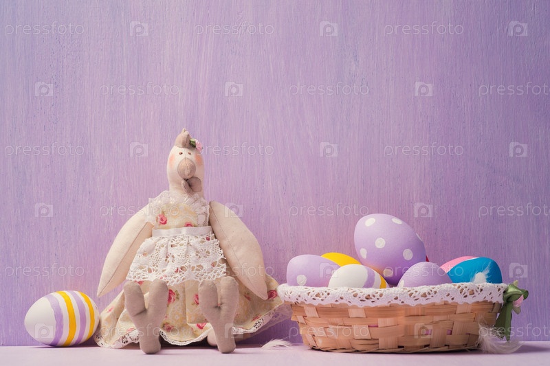 Крашеные пасхальные яйца и игрушечная курица