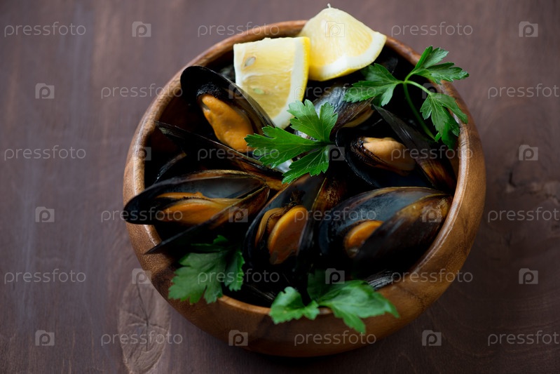 Вареные мидии с лимоном и петрушкой