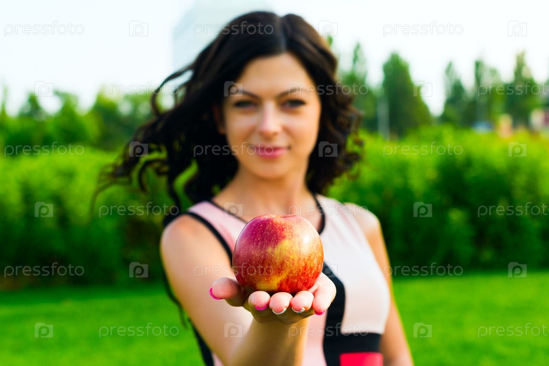 Молодая женщина держит яблоко
