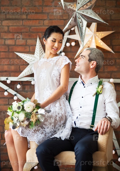 Молодожены на фоне кирпичной стены