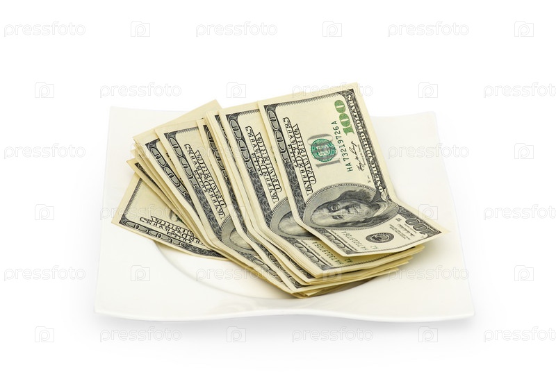 Долларовые купюры на белом блюдце