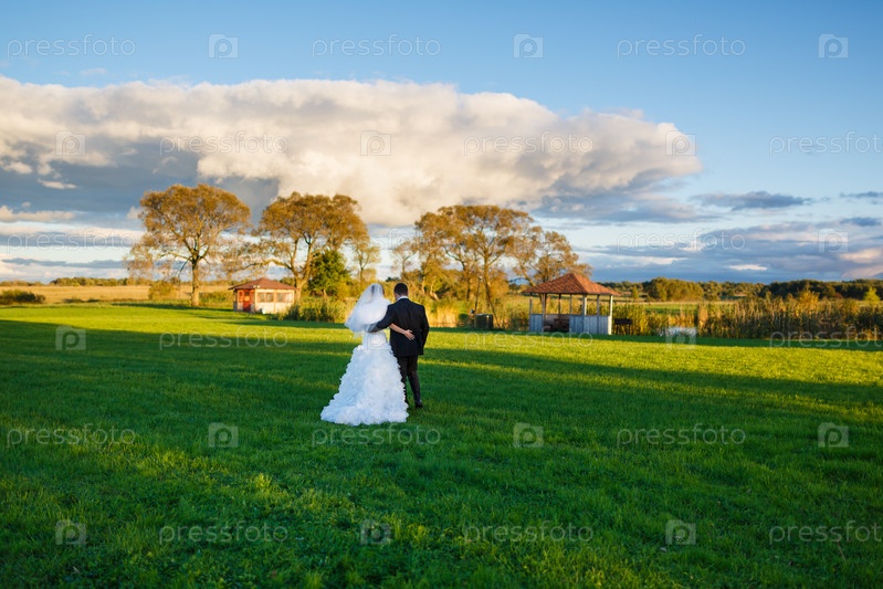 Невеста и жених идут по полю