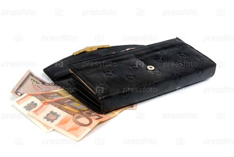 Черный кожаный бумажник с банкнотами евро на белом фоне