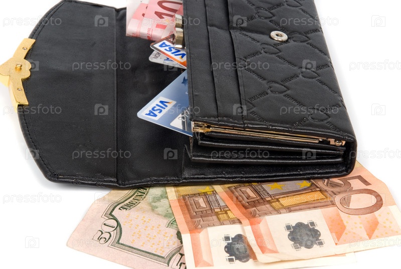 Черный кожаный бумажник с банкнотами евро на белом фоне