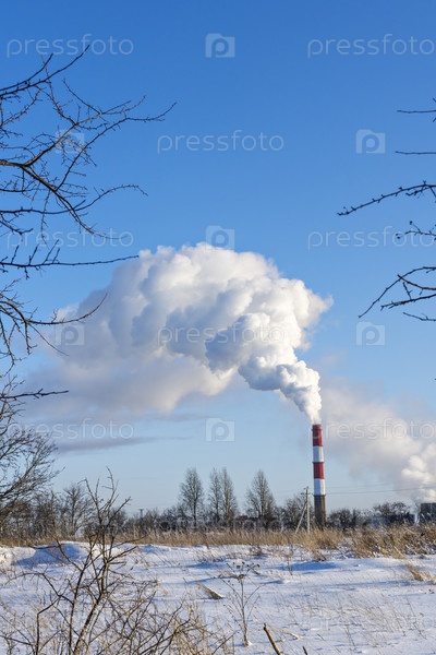 Выбросы из промышленной трубы тепловой электростанции в чистое небо