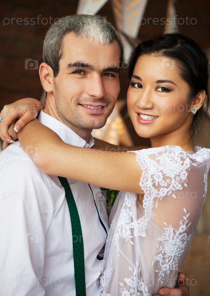Молодожены на фоне кирпичной стены