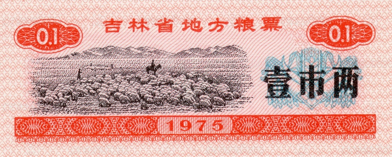 Банкнота Китай продовольственный купон 0,1 1975 год лицевая сторона