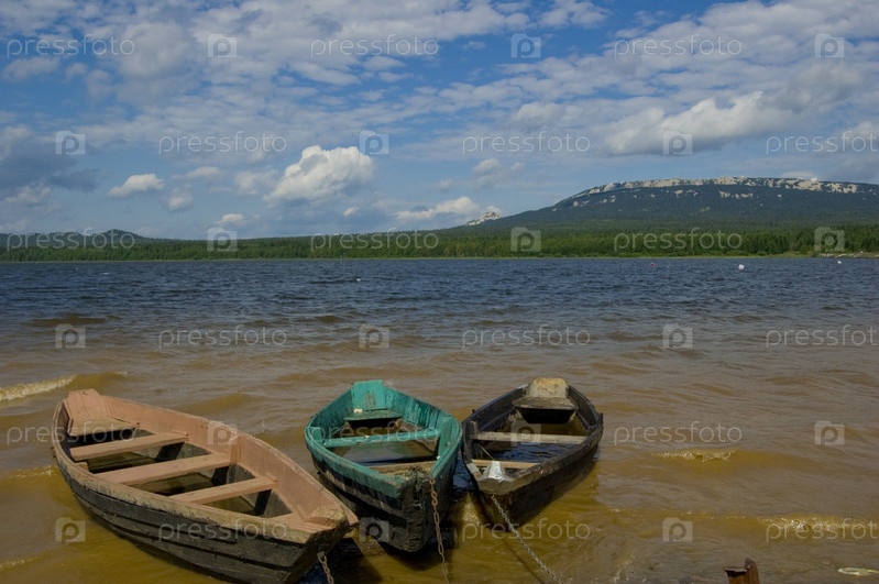 Три лодки на берегу озера Зюраткуль, Южный Урал
