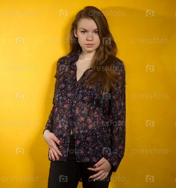 Девушка стоит возле желтой стены