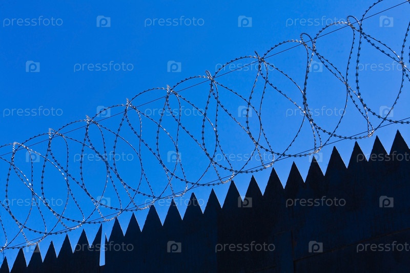 Колючяя проволока и ограда. Забор на голубом фоне.