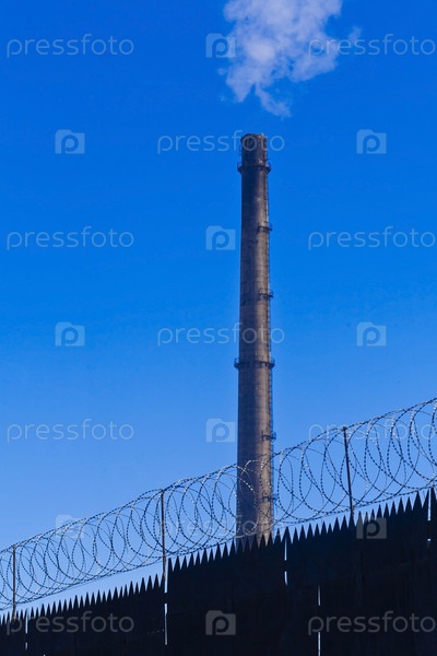 Дымящаяся труба за забором с колючей проволокой на фоне неба