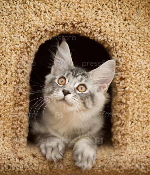 Котенок выглядывает из дома