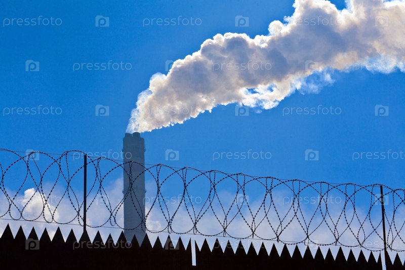 Дымящаяся труба за забором с колючей проволокой на фоне неба