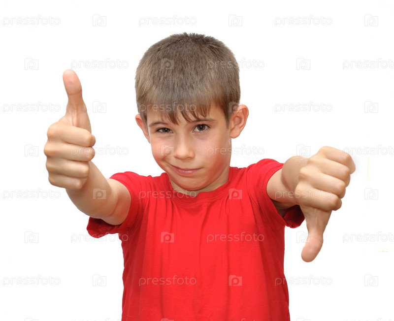 Мальчик показывает жесты одобрения и неодобрения, белый фон
