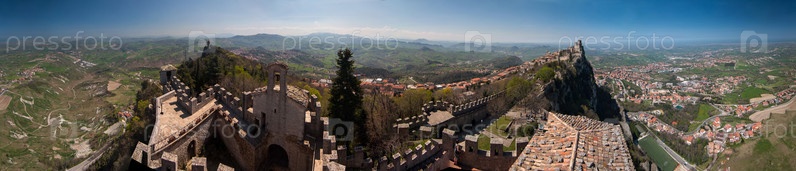 Круговая панорама (360 градусов, диорама) с видом на город и старые башни. Республика Сан-Марино