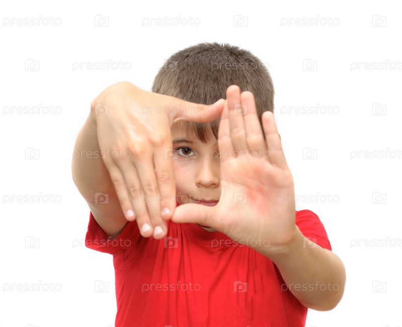 Мальчик ловит кадр руками, белый фон