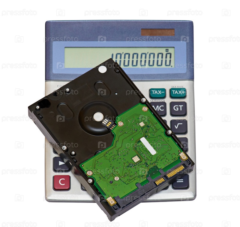 Жесткий диск и калькулятор на белом фоне