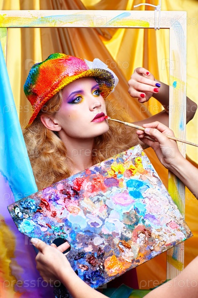 Художник делает макияж при помощи кисти и палитры