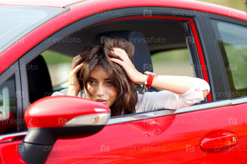 Молодая женщина в красном автомобиле