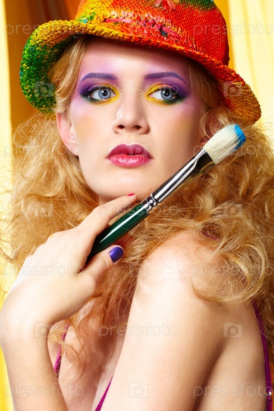 Портрет блондинки в яркой шляпе с кисточкой
