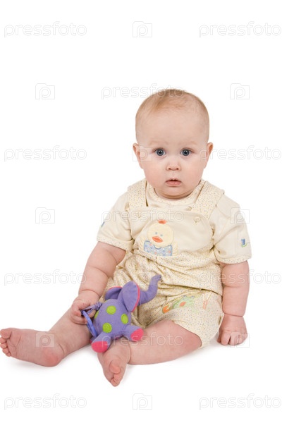 Маленький ребенок с игрушкой, изолирован на белом фоне