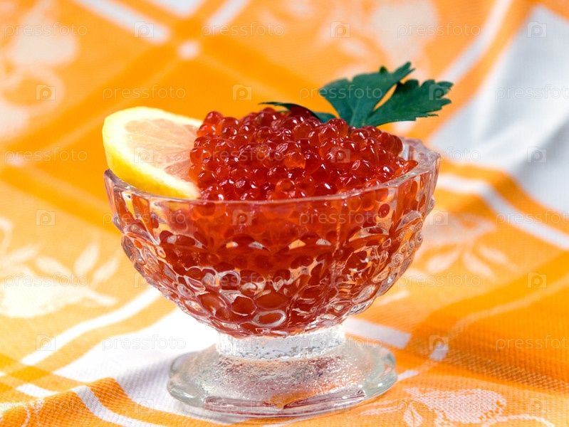 Долька лимона с красной икрой в хрустальной вазочке