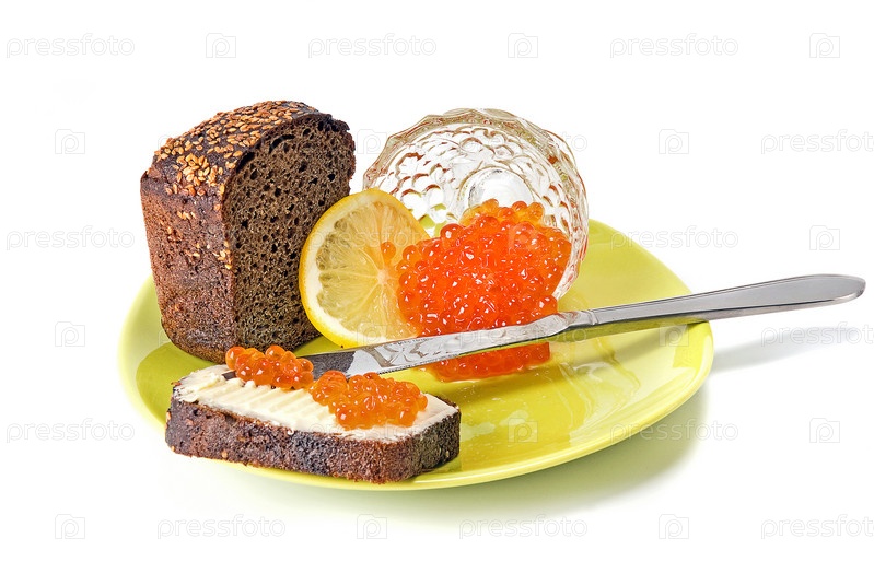 Бутерброд с красной икрой на тарелке